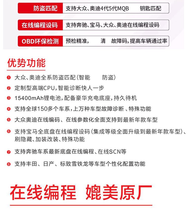 MaxiSys EliteMaxiSys®Elite汽車(chē)智能診斷系統是專業汽車(chē)診斷的新一代智能解決方案。采用NVIDIA的Tegra®4-PLUS-1四核1.8GHz處理(lǐ)器(qì),配備9.7英寸超靈敏電(diàn)容式視(shì)網膜屏,基于全新的Android多(duō)任務操作(zuò)系統,結合了最全的原廠級診斷車(chē)型覆蓋,從全面的車(chē)輛(liàng)診斷和(hé)分析到高(gāo)級ECU編程,MaxiSys Elite為(wèi)您提供方便、快速、高(gāo)效的汽車(chē)診斷解決方案。優勢功能1.  覆蓋MS908SPRO所有(yǒu)功能,新增大(dà)衆、奧迪全系防盜匹配 2.  定制(zhì)型高(gāo)端CPU,···