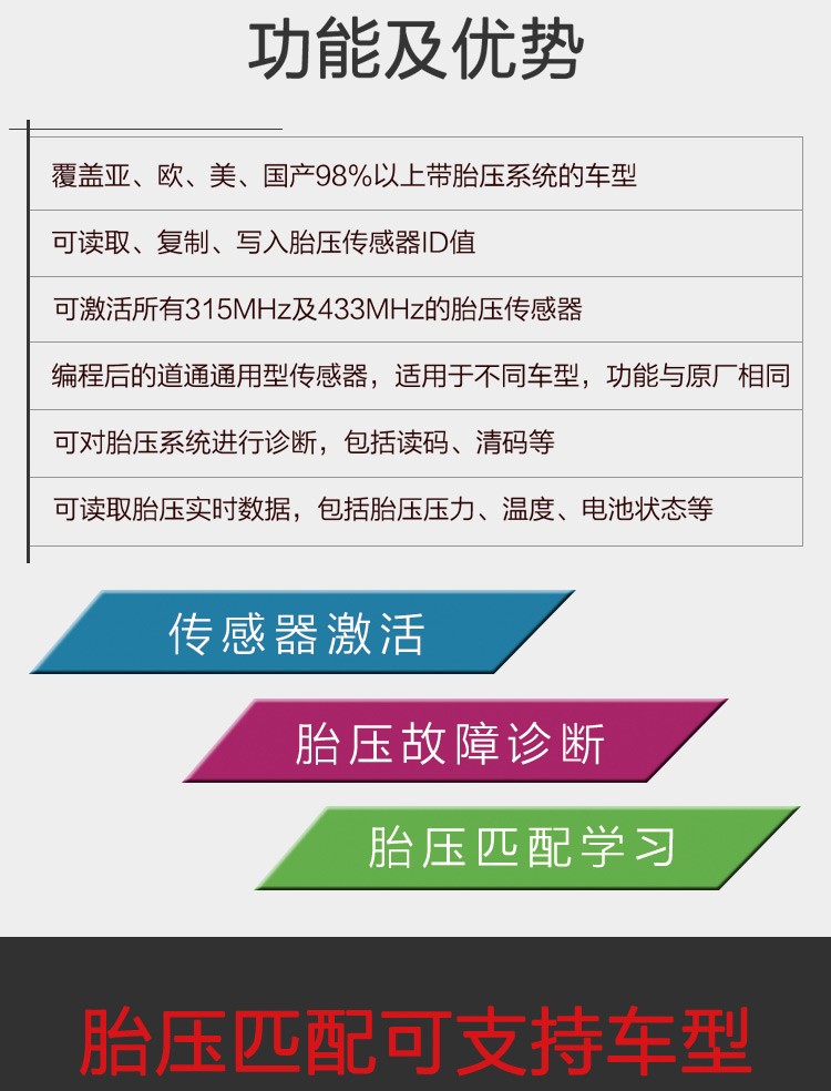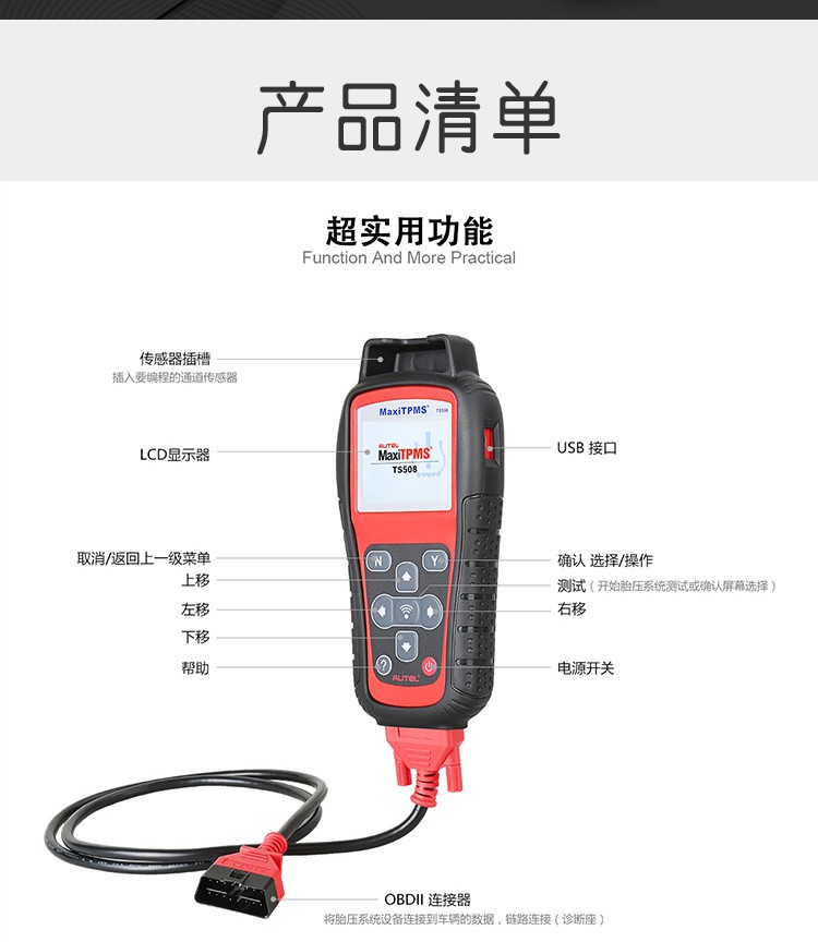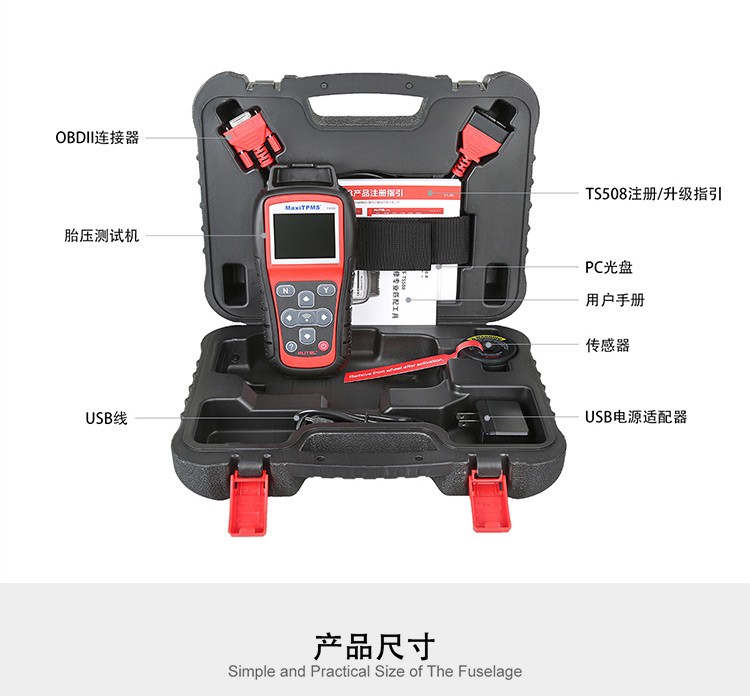 TS508是一款胎壓維修專業匹配工具。直觀的導航設計(jì),清晰的界面展示,符合人(rén)體(tǐ)工學的産品結構,操作(zuò)便捷,簡單易懂。TS508可(kě)激活不同頻率的胎壓傳感器(qì),信号強,可(kě)讀取胎壓傳感器(qì)實時(shí)數(shù)據,包括胎壓壓力、溫度、電(diàn)池狀态等;更具備編程傳感器(qì)、胎壓故障診斷、胎壓匹配學習等強大(dà)功能,是您進行(xíng)胎壓維修匹配的專業助手。​